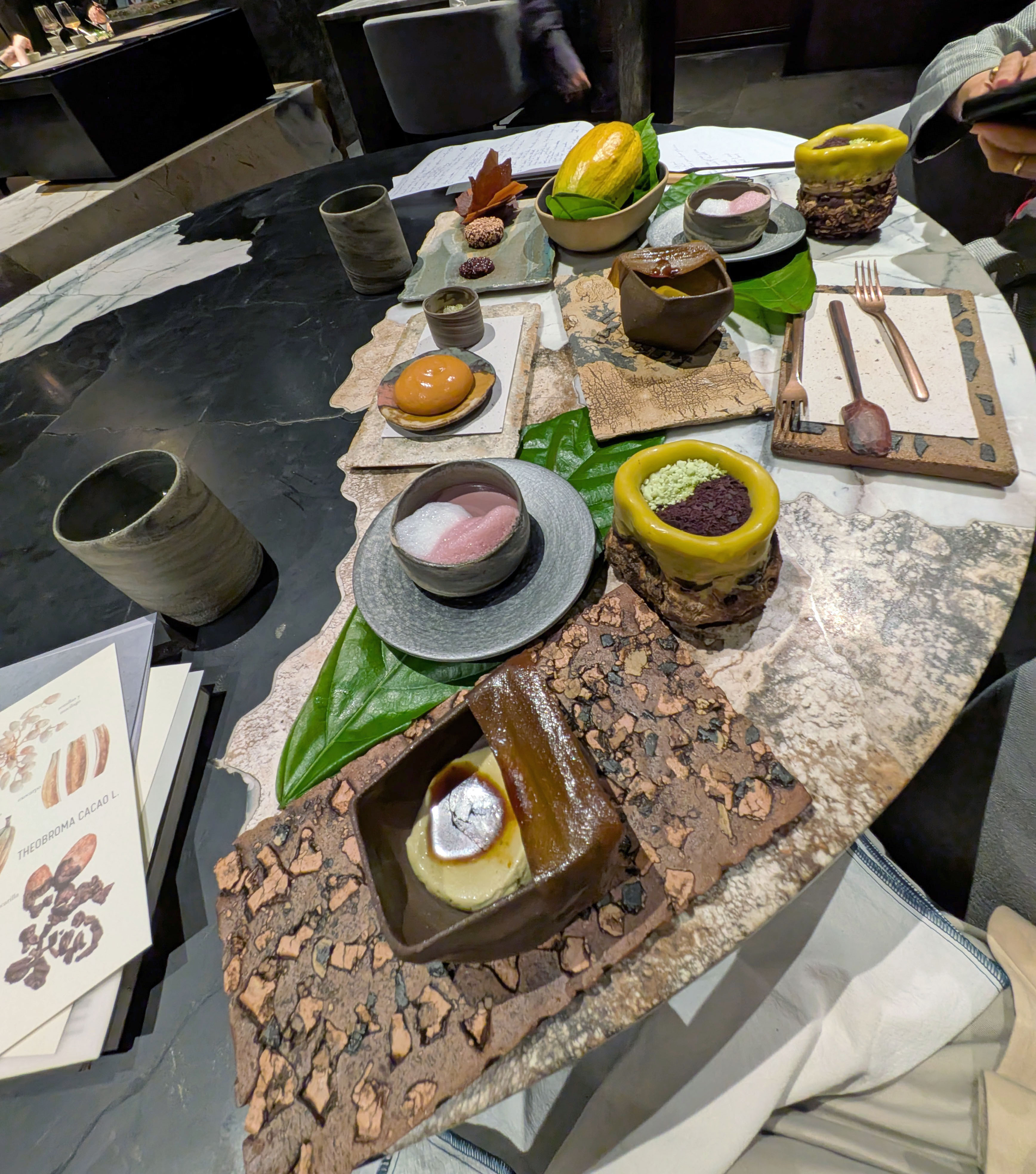It is a chocolate-themed multi-layered dessert of various forms. On the very exterior side is a dark chocolate glazed bomb covering a layer of chocolate mousse, with almond salted caramelized biscuit at the bottom. On the top of the cake is a twill for adornment along with Hazelnut sorbet, chocolate cream, hazelnut cream and toasted hazelnut. Chocolate is always welcome at the end of a meal. Besides the main dessert, there are petit fours. (19/20)